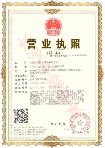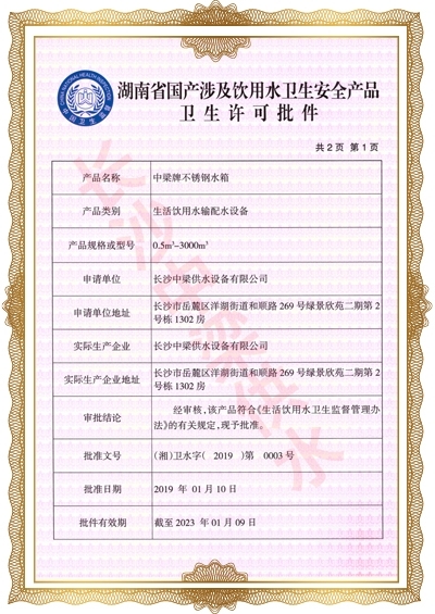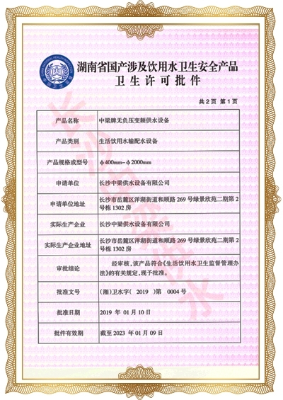 長沙中梁供水設備有限公司已先后通過湖南省衛(wèi)生廳國產(chǎn)涉及飲用水衛(wèi)生產(chǎn)品衛(wèi)生許可批準;